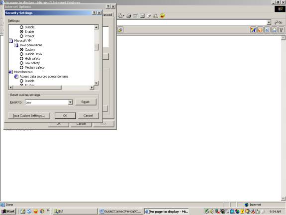 1.     Click on the “Tools” menu option. Go to “Internet Options…” under that. Go to “Security” tab. Select “Internet” and then click on “Custom level” button. Ensure that all the security settings should set as ‘enable’. If Microsoft VM is installed, ensure that you enable the ‘custom’ radio button. Repeat the same settings for the “Trusted Sites”.