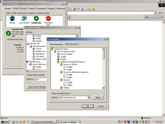 1. In the same ‘Security Settings’ (Tools >> Internet Options >> Security >> Internet >> Custom level >> Java Custom Settings) window, click ‘Java Custom Settings…’.  A new window will open.  Select the second panel ‘Edit Permissions’.  Ensure that all radio buttons are ‘Enabled’. Repeat the same settings for “Trusted Sites” (Tools >> Internet Options >> Security >> Trusted Sites >> Custom level >> Java Custom Settings).